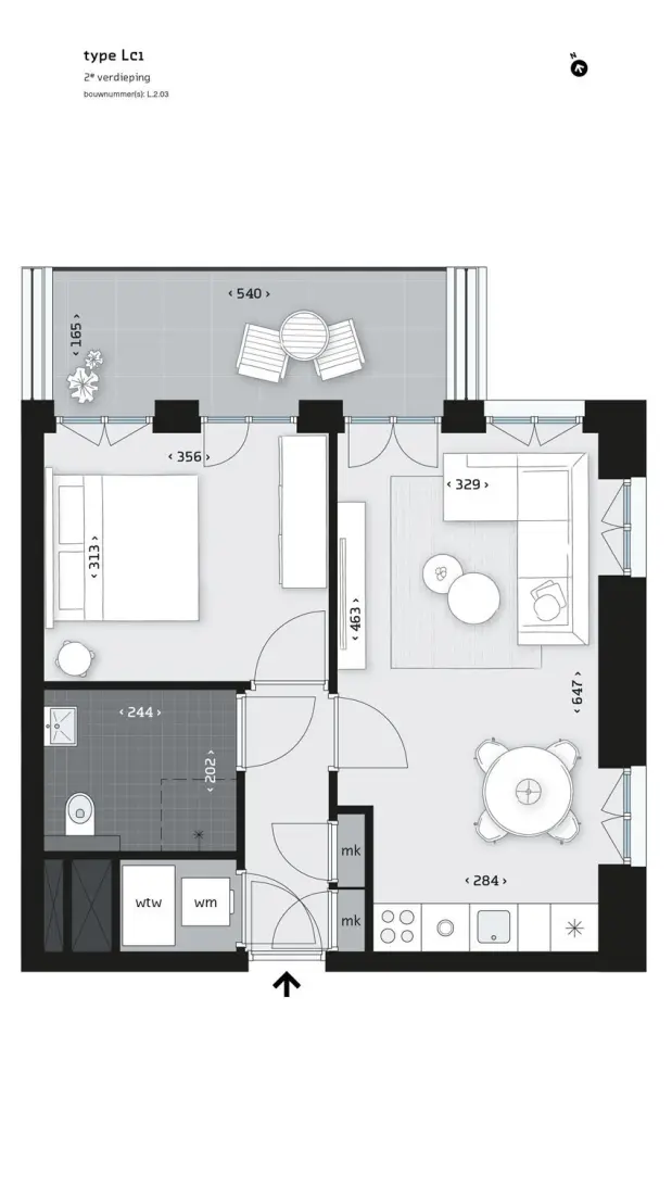 Apartment types Lb and Lc are ideally laid out and beautifully located on the green courtyard garden. The layout of the living room of Lc is similar to the living room of type Lb. Type Lb has no windows in the side elevation. Another difference concerns outdoor space. Lb1 and Lc1 have a large terrace facing the communal and very green courtyard garden. Lb2 and Lc2 have a balcony overlooking this communal garden.