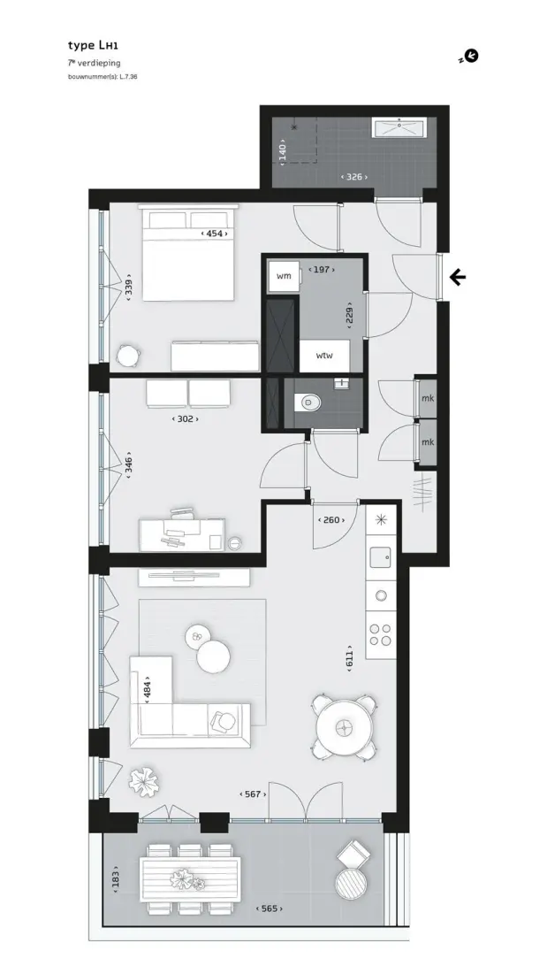 High-rise two-bedroom apartment with nice views over the Klaprozenbuurt. Lh1 has a large terrace across the width of the apartment. Lh2 has a balcony.