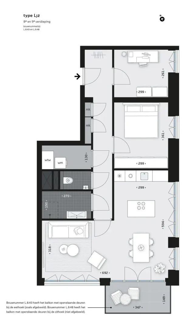 Ook dit ruime appartementstype met twee slaapkamers heeft een hoekligging en daardoor een living met veel lichtinval. Lj1 heeft een groot terras over de breedte van het appartement. Lj2 heeft een balkon.
