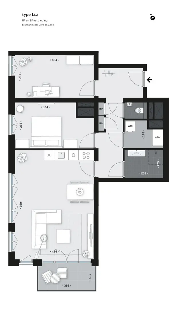 Dit ruime appartement met twee slaapkamers is op de hoek van de Klaprozenweg en de Klimopweg gelegen. Ll1 heeft een bijzonder groot terras dat aan de woonkamer en beide slaapkamers grenst. Ll2 heeft een balkon aan de living dat toegankelijk is met openslaande deuren.