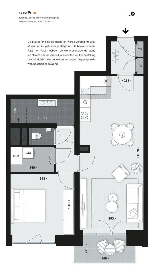 Up North's singel-bedroom apartments vary in size from 50 m2 to 69 m2 and can be found on the 1st to 4th floors. These 7 apartments come in 5 different types and thus have 5 unique floor plans! All are optimally laid out with a good master bedroom, bathroom, separate toilet (type Pn has the toilet in the bathroom) and attractive living room with kitchen area. The balcony or terrace from 4 m2 to around 11 m2 completes it all! Only type Pe is without outdoor space, but with the green Klimopplein at your feet, that's no problem!