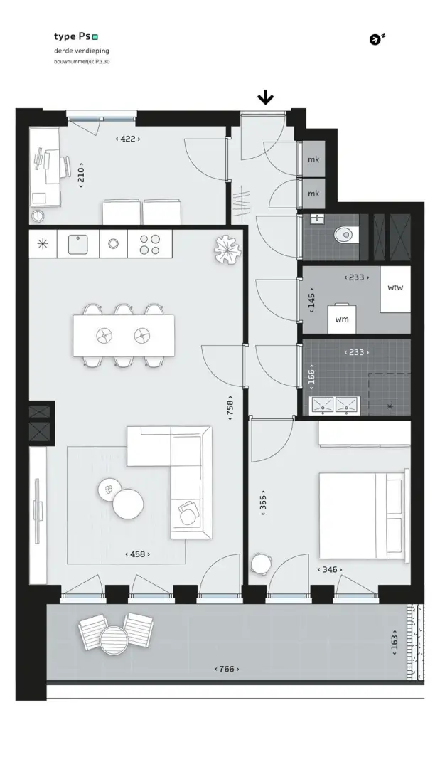 With a living area around 74-75 m², these are nicely laid-out flats. All count two bedrooms, a bathroom, separate toilet and fine living with kitchen area. Types Pp and Ps have a terrace of up to 14 m² across the entire width of the apartment! Type Pz has a nice balcony where you can enjoy the afternoon sun.