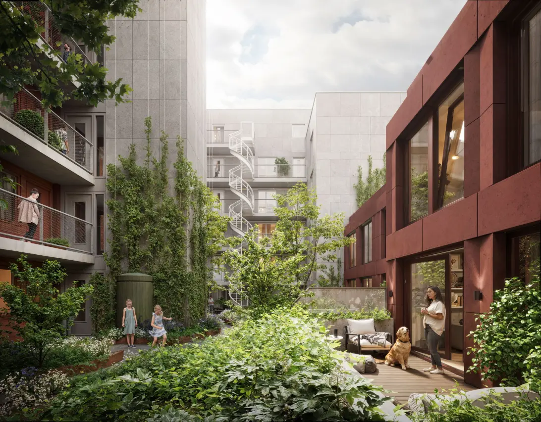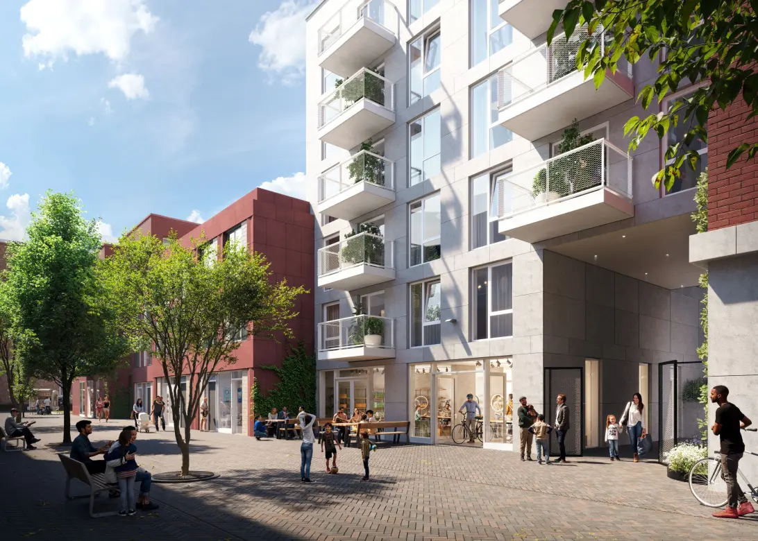 De gebouwen zijn met elkaar verbonden via een groene binnentuin, waardoor je snel je weg naar huis vindt. Onder de appartementen is een parkeergarage en op de begane grond vind je een gezamenlijke fietsenstalling. In totaal worden er 79 koopappartementen verdeeld over drie van de vijf panden. De overige twee panden bieden ruimte aan 90 sociale huurappartementen, wat bijdraagt aan de veelzijdigheid van de buurt.