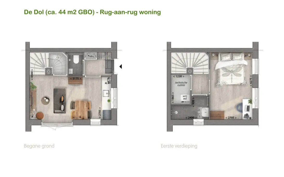 De Dol is een rug-aan-rug woning met een woonoppervlakte van circa 44 m2. De woning is op de begane grond uitgerust met een toilet, compacte keuken en woonkamer met openslaande deuren naar jouw tuin. Op de eerste verdieping vind je de slaapkamer (ca. 12 m2) en de badkamer met wastafel en een douche. Ook bevindt zich hier de technische ruimte. In de technische ruimte kun je ook jouw wasmachine en/of wasdroger aansluiten.