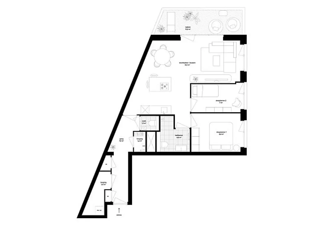 Zo beschikt dit appartement over een open keuken mét kookeiland! Dankzij de speelse indeling blijft er genoeg ruimte over voor een zithoek – met zicht over de stad – en een eettafel. De twee slaapkamers liggen naast de badkamer, voorzien van een inloopdouche, wastafel en toilet. In de gang bevindt zich een tweede toilet en de ruime berging met aansluitingen voor de wasmachine en droger.
