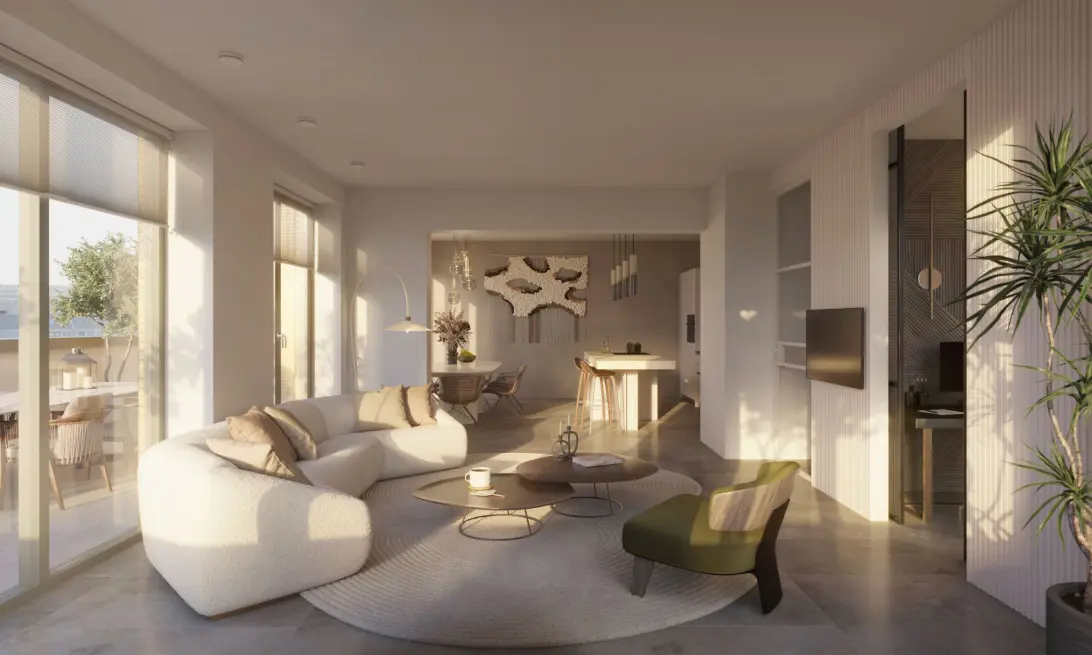De royale buitenruimten – brede veranda’s van maar liefst 7 tot 8 meter – bieden een perfecte balans tussen privacy en panoramisch uitzicht. De entreehal vormt de stijlvolle binnenkomer: een ruimte waarin luxe en verfijning samenkomen, dankzij de toepassing van terrazzo en keramische tegels. Een warm welkom in een woonomgeving waar design en comfort hand in hand gaan. Een elegante woonplek met 23 appartementen in 5 unieke woningtypen.