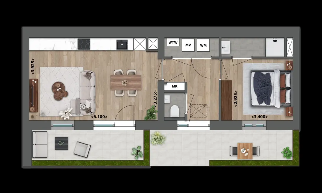 Dit appartement van circa 48 m² ligt op de derde verdieping en beschikt over een woonkamer met open keuken. De woning telt één slaapkamer, een badkamer en een apart toilet.