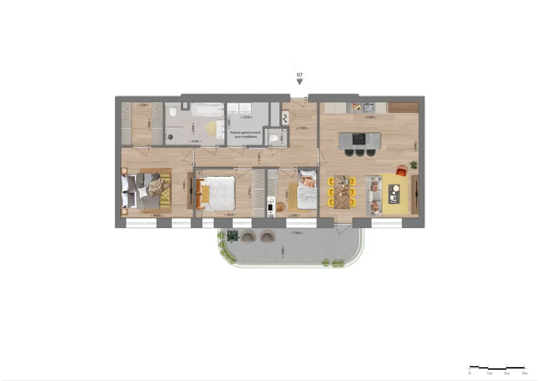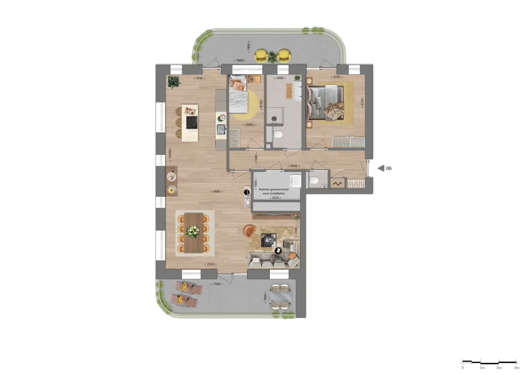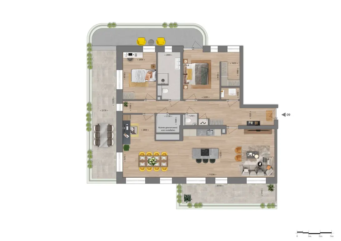 De 2 penthouses op de 3e verdieping hebben een riante living en een heerlijke buitenruimte.