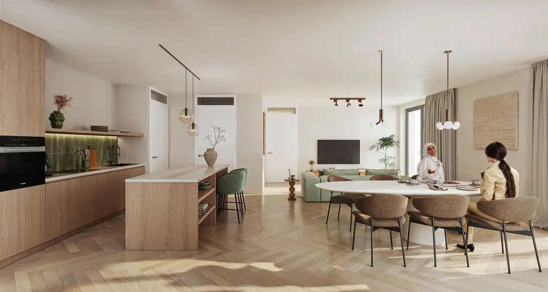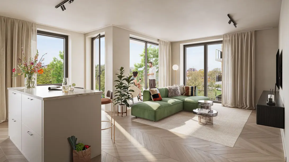 De appartementen in HONK zijn energiezuinig (A++/A+++), comfortabel en toekomstbestendig. Elk appartement heeft een eigen balkon of terras, en bewoners delen een verhoogd dakpark, groene corridor en gemeenschappelijke buitenruimtes. Parkeren doe je uit het zicht, in een ondergrondse garage of in een van de aangrenzende parkeerkoffers.