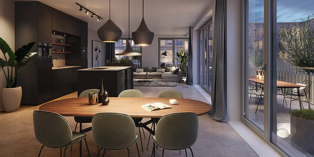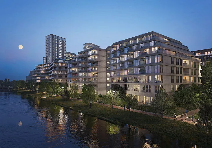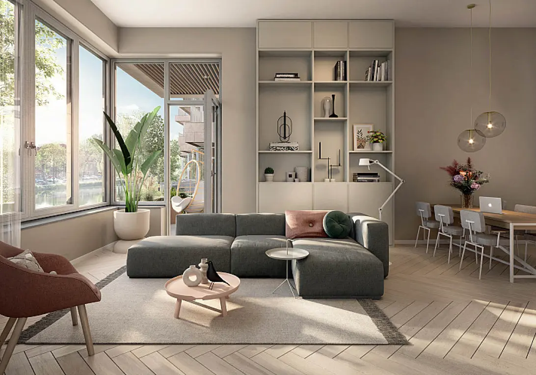 The Dock ligt op een unieke plek aan het water. Vanuit alle appartementen aan de oostzijde van het gebouw heb je uitzicht op de gemeenschappelijke binnentuin én het brede water van het Buiksloterkanaal. De vorm van het gebouw en de overhoekse ramen zorgen voor een optimale view en lichtinval in je woonkamer.