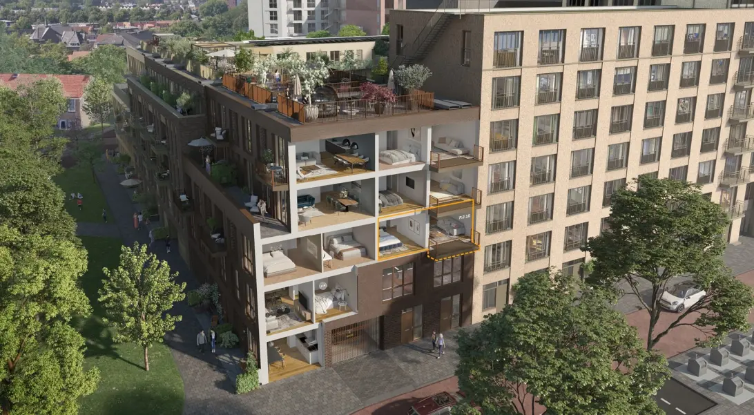 Up North’s singel-bedroom apartments vary in size from 50 m2 to 69 m2 and can be found on the 1st to 4th floors. These 7 apartments come in 5 different types and thus have 5 unique floor plans! All are optimally laid out with a good master bedroom, bathroom, separate toilet (type Pn has the toilet in the bathroom) and attractive living room with kitchen area. The balcony or terrace from 4 m2 to around 11 m2 completes it all! Only type Pe is without outdoor space, but with the green Klimopplein at your feet, that’s no problem!