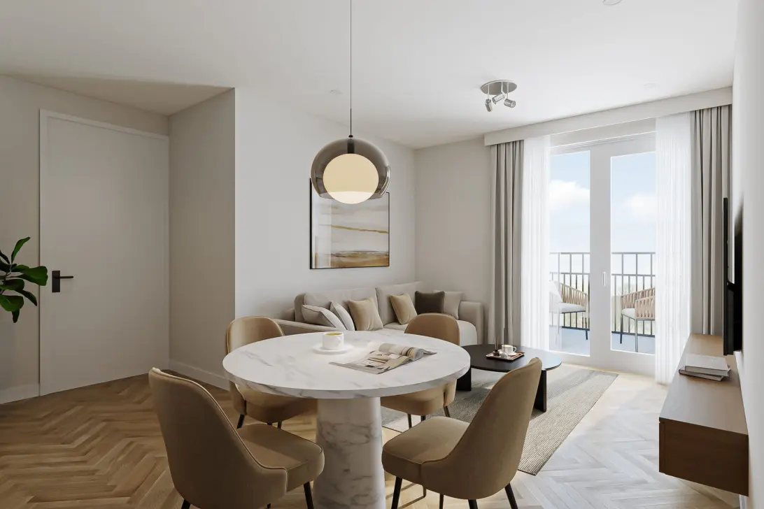 Licht, compact en slim ingedeeld — dit 3-kamerappartement van circa 58 m² biedt alles wat je nodig hebt voor comfortabel wonen. Vanuit de hal bereik je twee slaapkamers, de badkamer, een inpandige berging en de woonkamer met open keuken. Die woonkamer voelt ruim aan dankzij de grote raampartijen en geeft direct toegang tot het balkon van circa 8 m² op het zuidwesten. Hier geniet je van veel zon en een mooi uitzicht — buiten als verlengstuk van je woonruimte. De keuken is van Bruynzeel, het sanitair van Duravit.