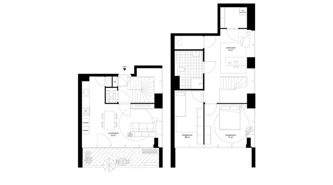 Deze unieke stadswoning van circa 88 m2 heeft een fraaie gevel op de hoek en een aparte woon- en slaapverdieping. Je komt binnen op de begane grond. De woonkamer en open keuken liggen aan het terras op het zuidoosten. Via de trap in de hal kom je op de eerste verdieping. Hier heb je een grote open ruimte die je bijvoorneeld als thuiskantoor of gym kunt inrichten. Verder is de slaapverdieping ingedeeld met twee slaapkamers, een badkamer met tweede toilet, dubbele wastafel en inloopdouche en twee bergingen voor de wasmachine, wasdroger en technische apparaten.