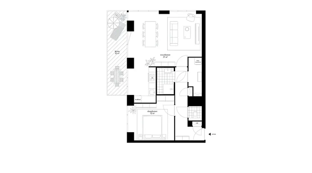 Dit 2-kamerappartement van ongeveer 62 m2 ligt op de 5e verdieping en heeft een fraai terras van circa 12 m2 op het zuidwesten. Vanwege de hoekligging heeft dit appartement extra ramen wat zorgt voor een mooie lichtinval. Het appartement is ingedeeld met een royale living met halfopen hoekkeuken, ruime slaapkamer, apart toilet en badkamer met wastafel en inloopdouche. In de berging kun je de wasmachine en wasdroger plaatsen en staan de technische apparaten.