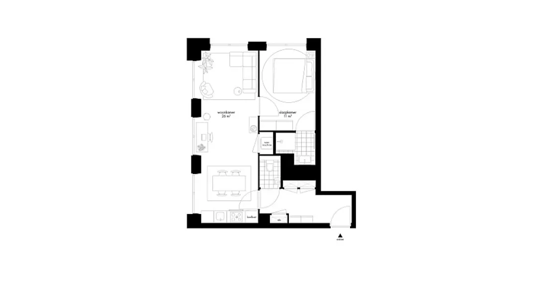 Dit 2-kamerappartement ligt op 5e tot en met de 10e verdieping. Het appartement heeft een woonoppervlakte van ongeveer 50 m² en is praktisch ingedeeld met een ruime living met open keuken, een slaapkamer met en suite badkamer en separaat toilet. Vanwege de hoekligging heeft dit appartement extra ramen in de living en keuken, wat zorgt voor een mooie lichtinval. De bergkast, met de aansluitingen voor de wasmachine en wasdroger, is bereikbaar vanuit de living.