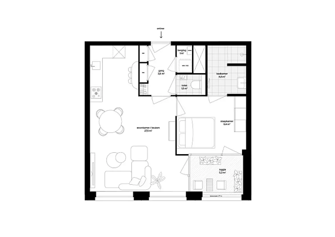 De open living met hoekkeuken is lekker ruim en via de grote ramen kijk je weg over de binnentuin in het hart van Dialogue. De slaapkamer heeft een ensuite badkamer met inloopdouche en in de hal vind je het separate toilet. In de berging stal je de wasmachine en droger. Extra bergruimte heb je in naar de parkeerkelder, waar nog een eigen berging is.