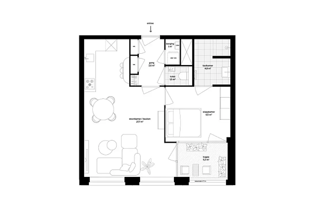In de living bevindt zich de open keuken, waar je tijdens het koken gezellig in contact blijft met je gasten. Ook loop je hier door naar de loggia, die trouwens ook bereikbaar is via de slaapkamer. De ensuite badkamer heeft een wastafel en inloopdouche en het toilet bevindt zich in de entreehal waar je ook de berging vindt. Hier is plek voor de wasmachine en droger. Tot slot is er in de parkeerkelder van het gebouw een eigen berging.
