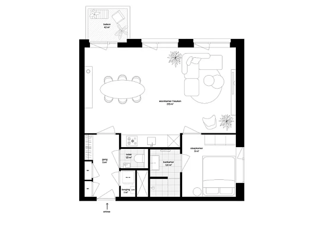 De brede living heeft de keuken die in een nis valt, dus er is volop plek voor een eettafel en zithoek. Via de slaapkamer bereik je de badkamer, die is voorzien van een wastafel en inloopdouche. Het toilet bevindt zich in de entreehal naast de berging met plek voor de wasmachine en droger. Tot slot is er in de parkeerkelder van het gebouw een berging.