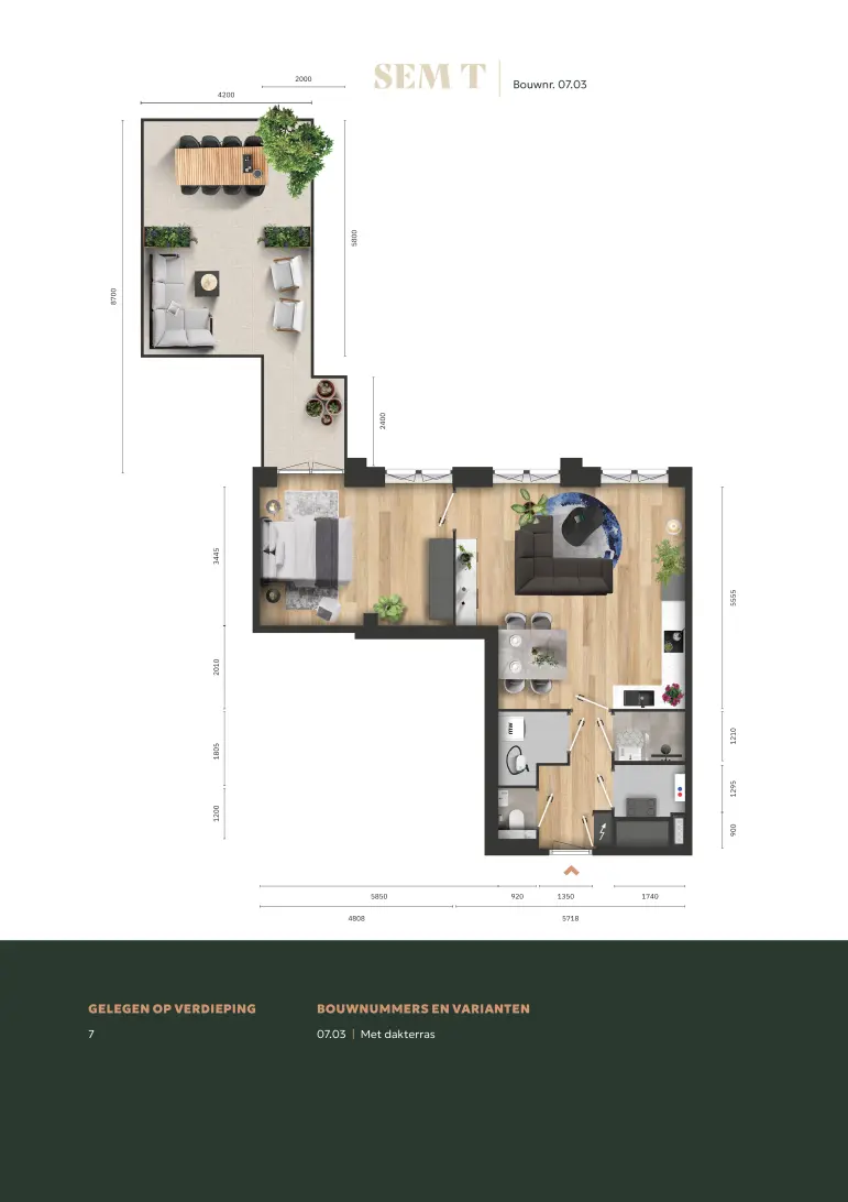 Een L-vorming tweekamerappartement met een royale slaapkamer en royaal dakterras of balkon.
