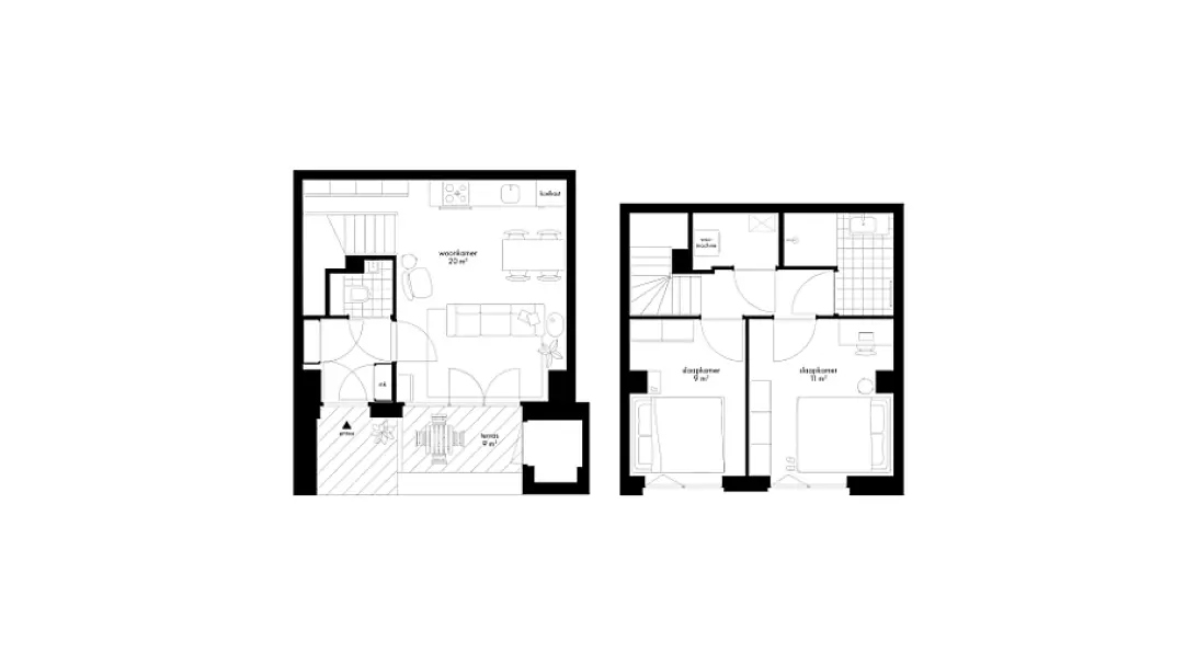Deze 3-kamerwoning van circa 63 m2 ligt op de begane grond en eerste verdieping, dus bestaat uit twee woonlagen. Je hebt een eigen entree aan de straat en een terras van circa 9 m2 op het zuidoosten. Het terras bereik je via de openslaande deuren vanuit de living met open keuken. Via de trap kom je boven in het slaapdomein. Deze verdieping is ingedeeld met twee slaapkamers en een badkamer met een inloopdouche en wastafel. In de master bedroom kun je een werkhoek creëren, mocht je regelmatig thuiswerken. De berging biedt plaats voor de wasmachine. Hier staan ook de technische apparaten.