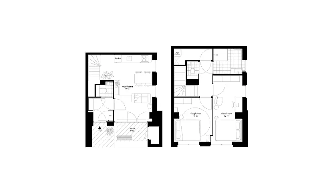 Deze 3-kamerwoning van circa 67 m2 ligt op de begane grond en eerste verdieping, dus bestaat uit twee woonlagen. Vanwege de ligging op de hoek heb je extra ramen in de zijgevel, wat zorgt voor een optimale lichtinval. Je hebt een eigen entree aan de straat en een terras van circa 9 m2 op het zuidoosten. Het terras bereik je via de openslaande deuren vanuit de living met open keuken. Via de trap kom je boven in het slaapdomein. Deze verdieping is ingedeeld met twee slaapkamers, een badkamer met een inloopdouche en wastafel en een apart toilet. De master bedroom biedt alle ruimte om een inloopkast te creëren. Of een werkhoek, als je regelmatig thuiswerkt. In de berging kun je de wasmachine en wasdroger plaatsen en staan de technische apparaten.