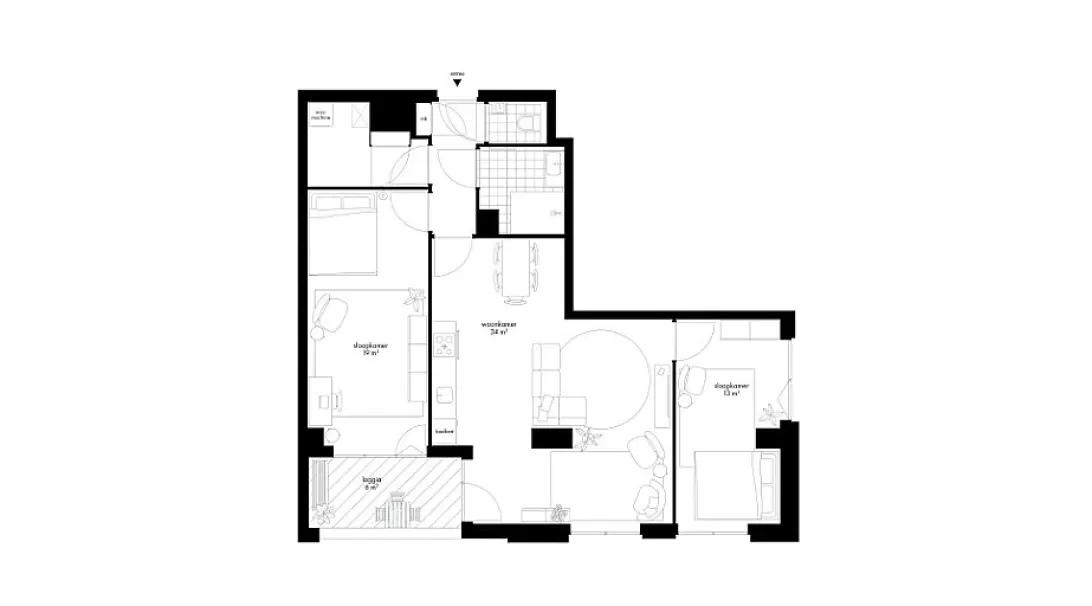 Dit 3-kamerappartement ligt op 1e en 2e verdieping en heeft een woonoppervlakte van ongeveer 85 m². Het appartement is ingedeeld met een royale living met open keuken, loggia van 6 m² en twee ruime slaapkamers. De master bedroom biedt alle ruimte om een inloopkast te creëren. Of een werkhoek, als je regelmatig thuiswerkt. Aan de hal liggen het apart toilet, de badkamer en de berging. In de berging kun je de wasmachine en wasdroger plaatsen en staan de technische apparaten. Bovendien kun je er nog van alles opbergen, zoals ski- en kerstspullen. Het halletje bij de slaapkamers biedt ruimte voor extra kasten.