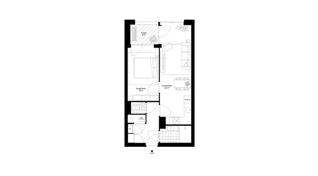 Dit 2-kamerappartement ligt op de 2e verdieping en heeft een woonoppervlakte van ongeveer 49 m². Het appartement is ingedeeld met een living met open hoekkeuken, loggia, ruime slaapkamer, apart toilet en badkamer met wastafel en inloopdouche. De loggia is bereikbaar vanuit de living en de slaapkamer. In de berging kun je de wasmachine en wasdroger op elkaar plaatsen en staan de technische apparaten.
