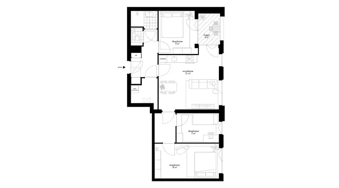 Dit 4-kamerappartement ligt op 3e verdieping en heeft een woonoppervlakte van ongeveer 72 m². Het appartement is ingedeeld met een living met open keuken, loggia en drie slaapkamers. Aan de hal liggen het apart toilet, de badkamer en de berging. In de berging kun je de wasmachine en wasdroger plaatsen en staan de technische apparaten. Bovendien kun je er nog van alles opbergen, zoals ski- en kerstspullen. Het halletje bij de twee slaapkamers biedt ruimte voor extra kasten.