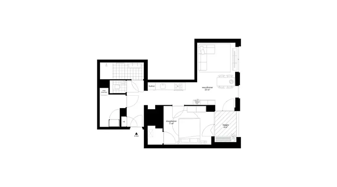 Dit 2-kamerappartement ligt op 3e verdieping en heeft een woonoppervlakte van ongeveer 54 m². Het appartement is ingedeeld met een L-vormige living met open keuken, loggia, een slaapkamer, apart toilet, badkamer en twee bergingen. In de grote berging kun je de wasmachine en wasdroger plaatsen. De tweede berging bereik je vanaf de slaapkamer: hier staan de technische apparaten.