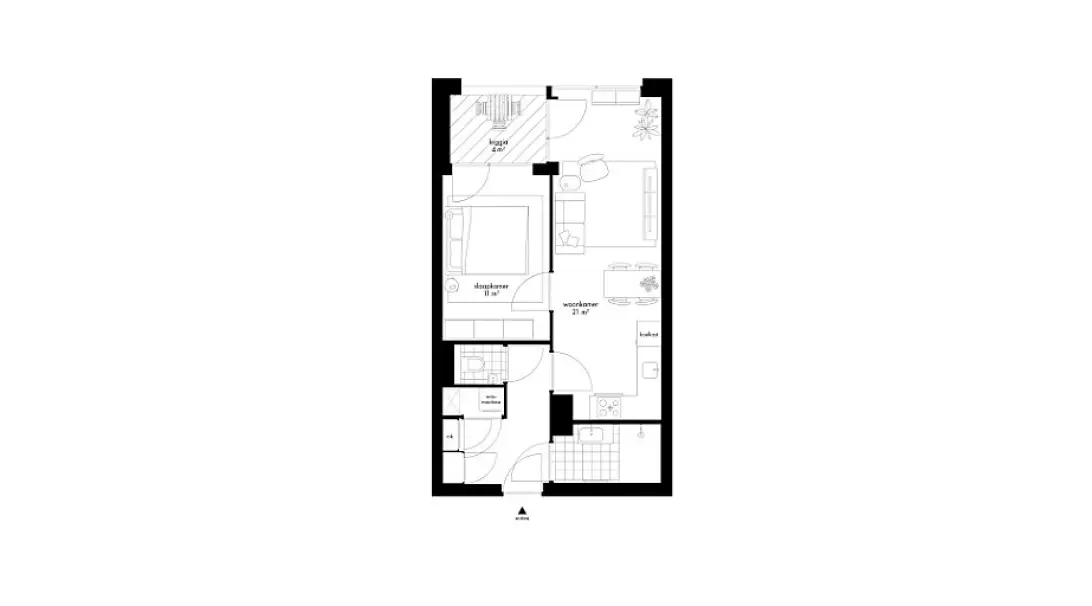 Dit compacte 2-kamerappartement ligt op de 3e verdieping. Het appartement heeft een woonoppervlakte van ongeveer 46 m² en is ingedeeld met een living met open hoekkeuken, loggia, ruime slaapkamer, apart toilet en badkamer met wastafel en inloopdouche. De loggia is bereikbaar vanuit de living en de slaapkamer. In de berging kun je de wasmachine en wasdroger op elkaar plaatsen en staan de technische apparaten.