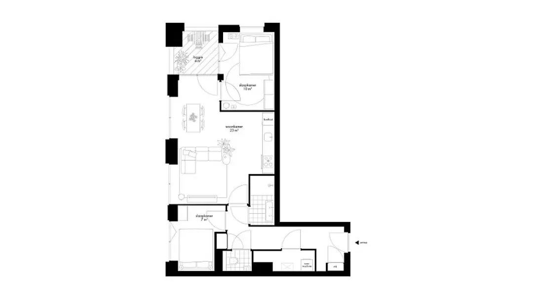 Dit 3-kamerappartement ligt op 3e verdieping en heeft een woonoppervlakte van ongeveer 60 m². Vanwege de hoekligging heeft dit appartement extra ramen wat zorgt voor een mooie lichtinval. Het appartement is ingedeeld met een living met open keuken, loggia en twee slaapkamers. Aan de hal liggen het apart toilet, de badkamer en de berging voor de wasmachine, wasdroger en de technische apparaten.