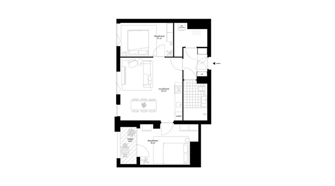 Dit 3-kamerappartement ligt op 4e verdieping en heeft een woonoppervlakte van ongeveer 68 m². Het appartement is ingedeeld met een living met open keuken, loggia en twee ruime slaapkamers. Aan de hal liggen de berging en de badkamer met inloopdouche, wastafel en toilet. In de berging kun je de wasmachine en wasdroger plaatsen en staan de technische apparaten. Bovendien kun je er nog van alles opbergen, zoals koffers, ski- en kerstspullen.