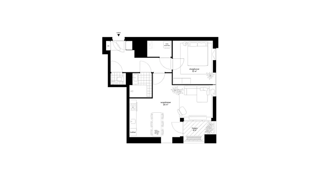 Dit 2-kamerappartement ligt op 5e verdieping en heeft een woonoppervlakte van ongeveer 57 m². Vanwege de hoekligging heeft dit appartement extra ramen wat zorgt voor een mooie lichtinval. Het appartement is ingedeeld met een living met open keuken, loggia, slaapkamer, separaat toilet en badkamer. In de berging kun je de wasmachine en wasdroger plaatsen en staan de technische apparaten.