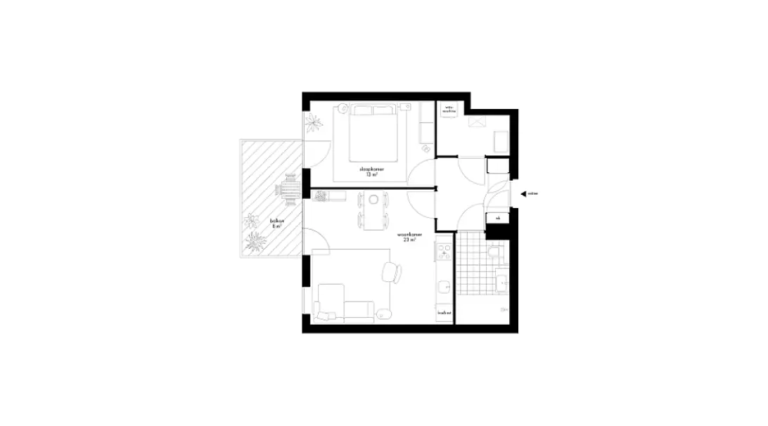 Dit 2-kamerappartement ligt op de 6e verdieping en heeft een woonoppervlakte van ongeveer 58 m². Het appartement is ingedeeld met een carré-vormige living met open keuken, een ruime slaapkamer, berging en badkamer met inloopdouche, wastafel en toilet. In de berging kun je de wasmachine en wasdroger op elkaar plaatsen en staan de technische apparaten. Bijzonder prettig is het balkon aan de living én slaapkamer, met een ideale zonligging op het zuidwesten.
