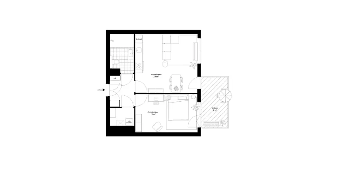 Dit 2-kamerappartement ligt op de 7e tot en met de 11e verdieping en heeft een woonoppervlakte van ongeveer 58 m². Het appartement is ingedeeld met een carré-vormige living met open keuken, een ruime slaapkamer, berging en badkamer met inloopdouche, wastafel en toilet. In de berging kun je de wasmachine en wasdroger op elkaar plaatsen en staan de technische apparaten. Bijzonder prettig is het balkon aan de living én slaapkamer, met een zonligging op het noordoosten.