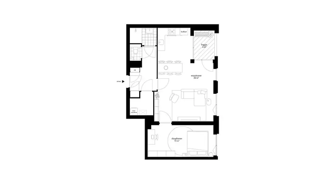 Dit 2-kamerappartement ligt op de begane grond. Het appartement heeft een woonoppervlakte van ongeveer 62 m² en is ingedeeld met een ruime living met open hoekkeuken, loggia, slaapkamer, apart toilet en badkamer met wastafel en inloopdouche. De master bedroom biedt alle ruimte om een inloopkast te creëren. Of een werkhoek, als je regelmatig thuiswerkt. In de berging kun je de wasmachine en wasdroger plaatsen en staan de technische apparaten. De loggia van circa 4 m2 heeft een zonligging op het noordoosten.