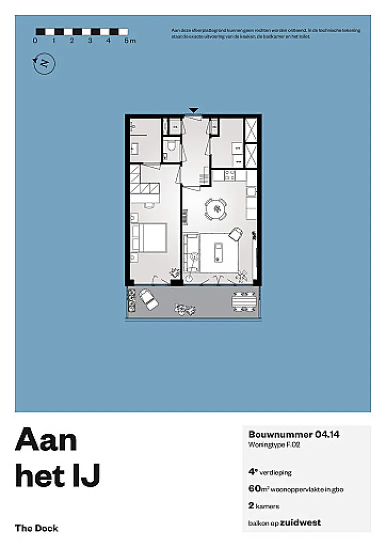 Het appartement heeft een oppervlakte van ongeveer 60 m² en is ingedeeld met een living met open hoekkeuken en een ruime slaapkamer met ensuite badkamer. In de berging heb je ruimte voor een wasmachine en wasdroger en staan de technische apparaten.
